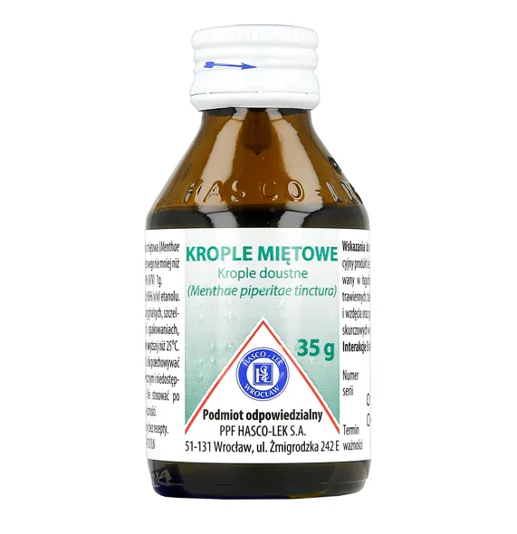 nalewka miętowa (Menthae piperitae tinctura) o zawartości olejku miętowego nie mniej niż 5%, DER 1:19,7-21, ekstahent: etanol 90% (v/v) 1 g.